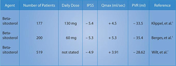 Table 1. Summary of Key Randomized Studies of Beta-Sitosterol in BPH Patients. Effects of Beta-Sitosterol on the International Prostate Symptom Score (IPSS), maximum urinary flow rate (Qmax), and post-void residual volume (PVR) are remarkably consistent. The study by Wilt and colleagues7 examined four different randomized studies. |